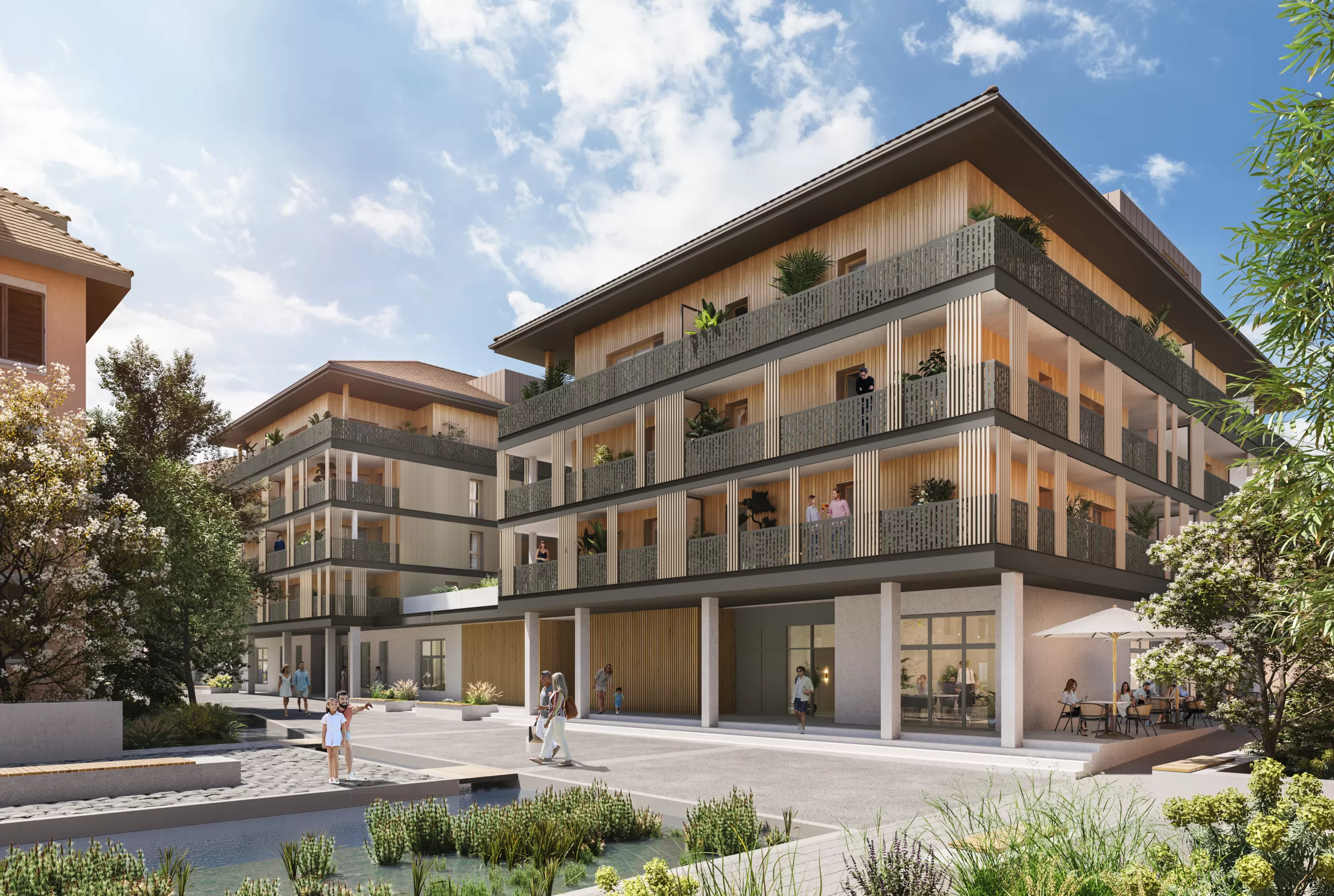 Fruit du savoir-faire conjugué de PRIAMS et de Bart, la résidence neuve Les Nouveaux Quais s’intègre harmonieusement dans son environnement. Elle marie à la perfection architecture contemporaine, matériaux qualitatifs et cadre arboré agréable. En témoignent les aménagements très qualitatifs distinguant la réalisation, notamment l’allée piétonne reliée aux quais de l’Arve. Animée de placettes et d’une fontaine, ponctuée d’assises pour se reposer, elle longe une mini-rivière créée spécialement pour augmenter la sensation de bien-être.