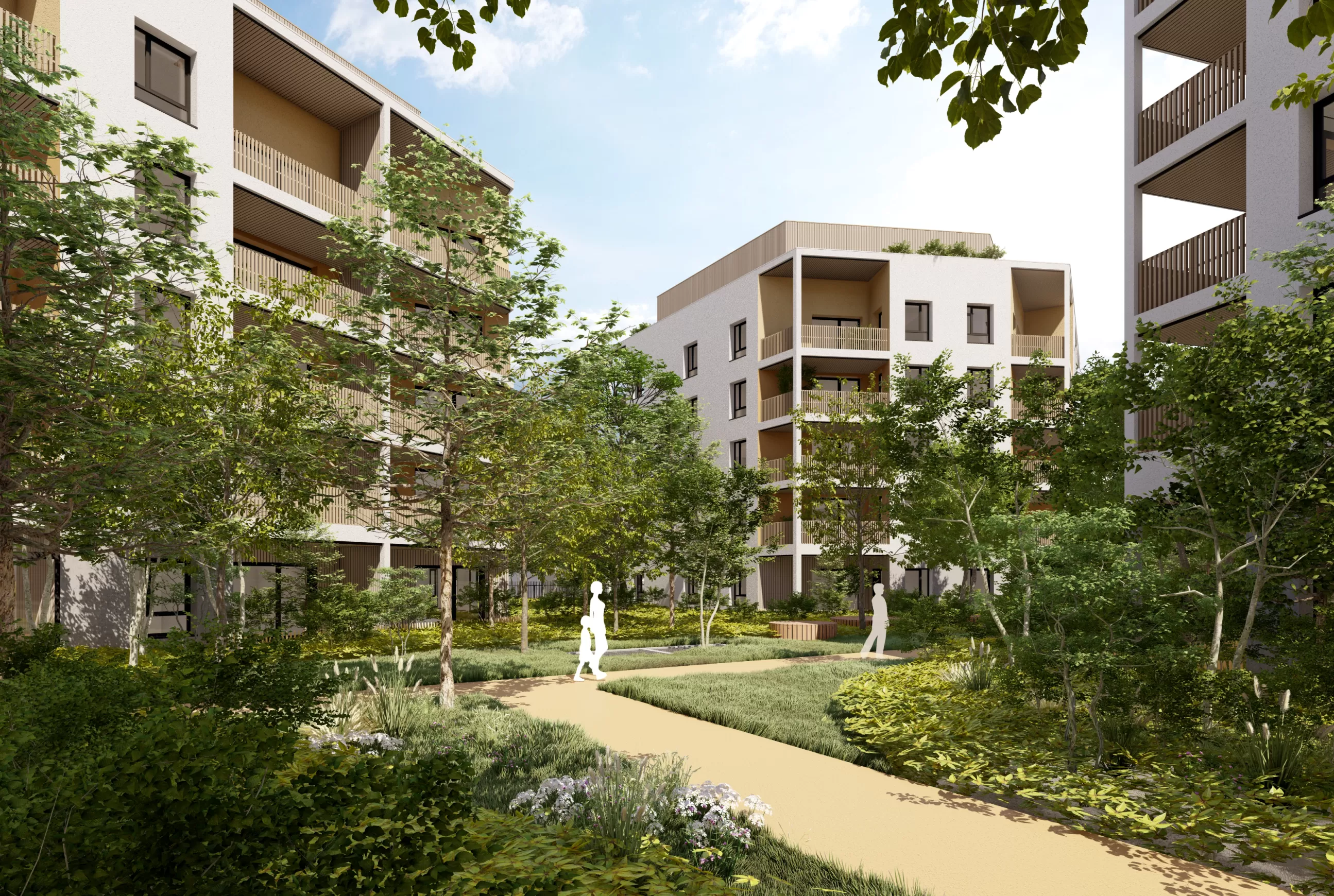 La résidence met également l'accent sur la dimension paysagère, avec des toitures végétalisées, des jardinières et des bandes végétales contribuant à une qualité de vie optimale, tout en offrant des cheminements rectilignes pour un accès facilité aux halls d’entrée et une continuité paysagère agréable.
